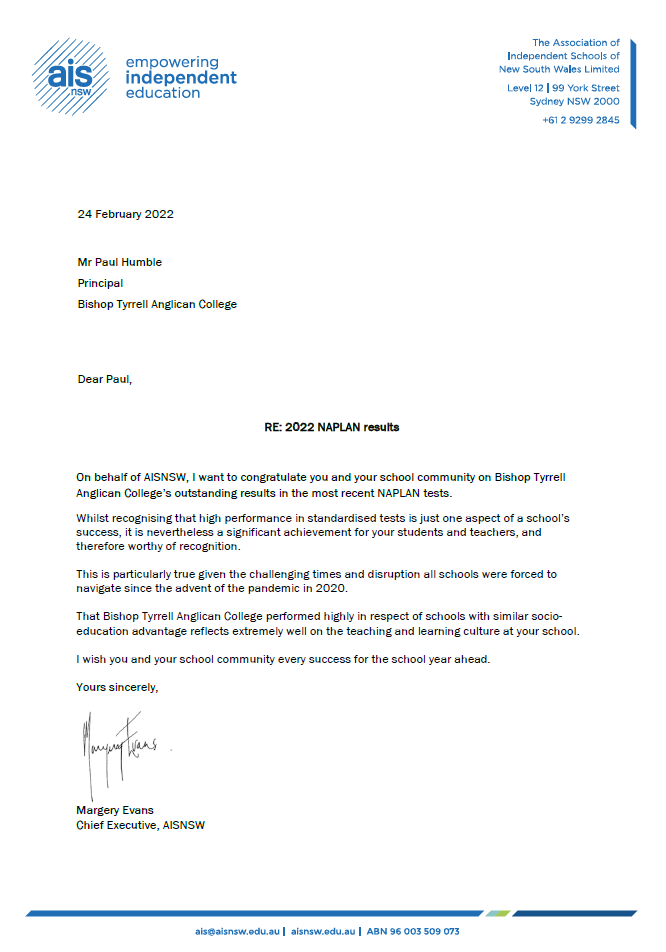 We are thrilled to share that our school has achieved exceptional NAPLAN results, as communicated to our Principal, Mr Paul Humble by Margery Evans, Chief Executive of the Association of Independent Schools of NSW. This news is a testament to the hard work and dedication of our students and staff.